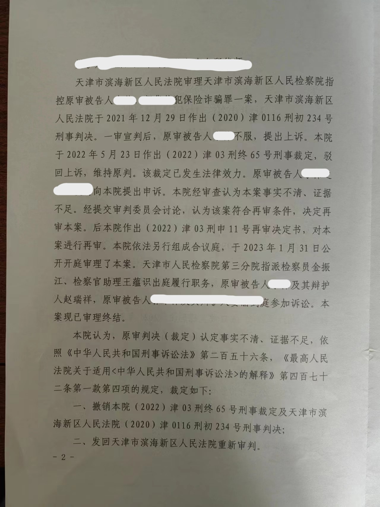 天津塘沽“迈凯伦”豪车骗保案,被告人一审被判七年半有期徒刑,代理二审维持原判,代理申诉,成功再审,代理再审,结果发回重审,重审后更改罪名为妨害作证罪判刑两年十个月,被告人上诉后再次代理二审,最终判处缓刑当事人获释。